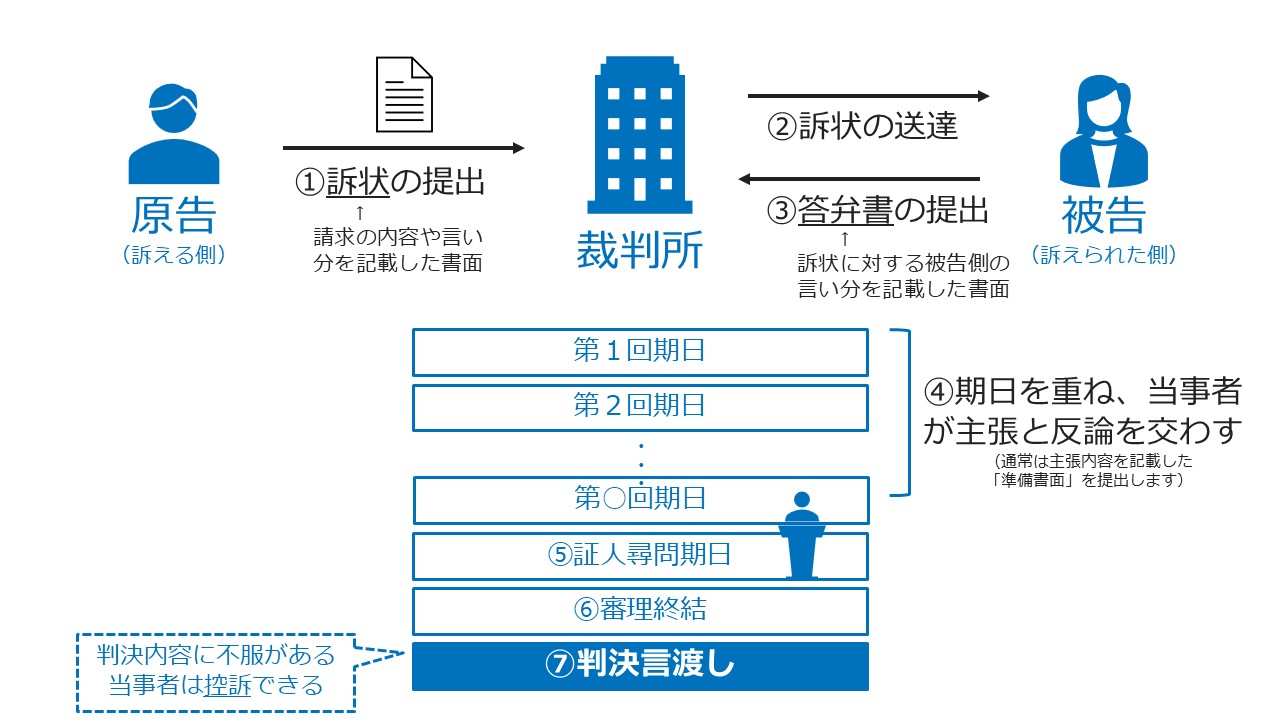 裁判の流れは、一度体験してみないとわかりにくいかもしれませんね。原告(訴える方)が訴状に訴えたい内容を記載して裁判所に提出し、被告(訴えられた方)が答弁書で反論します。その後、主張や反論を繰り返し、証拠や証言を踏まえて審理が行われ、最終的に裁判所が判決を出すという流れですね。判決まで1年以上かかることもあります。今回のように、判決が出る前に和解になるケースも多いですね。また、労働関係に関するトラブルについては、原則3回以内の期日で審理を終え、早期の解決を目指す「労働審判」という手続もあります。気になったら「労働審判」でWeb検索してみよう。